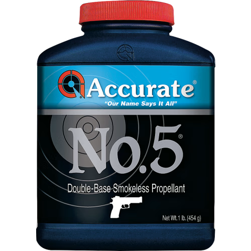 Accurate No. 5 is a medium-burn double-base spherical pistol powder known for its versatility and smooth operation. It provides excellent flow through progressive presses, consistent velocities, and clean burning — making it a favorite for both target loads and defensive ammunition in a wide range of handgun calibers.